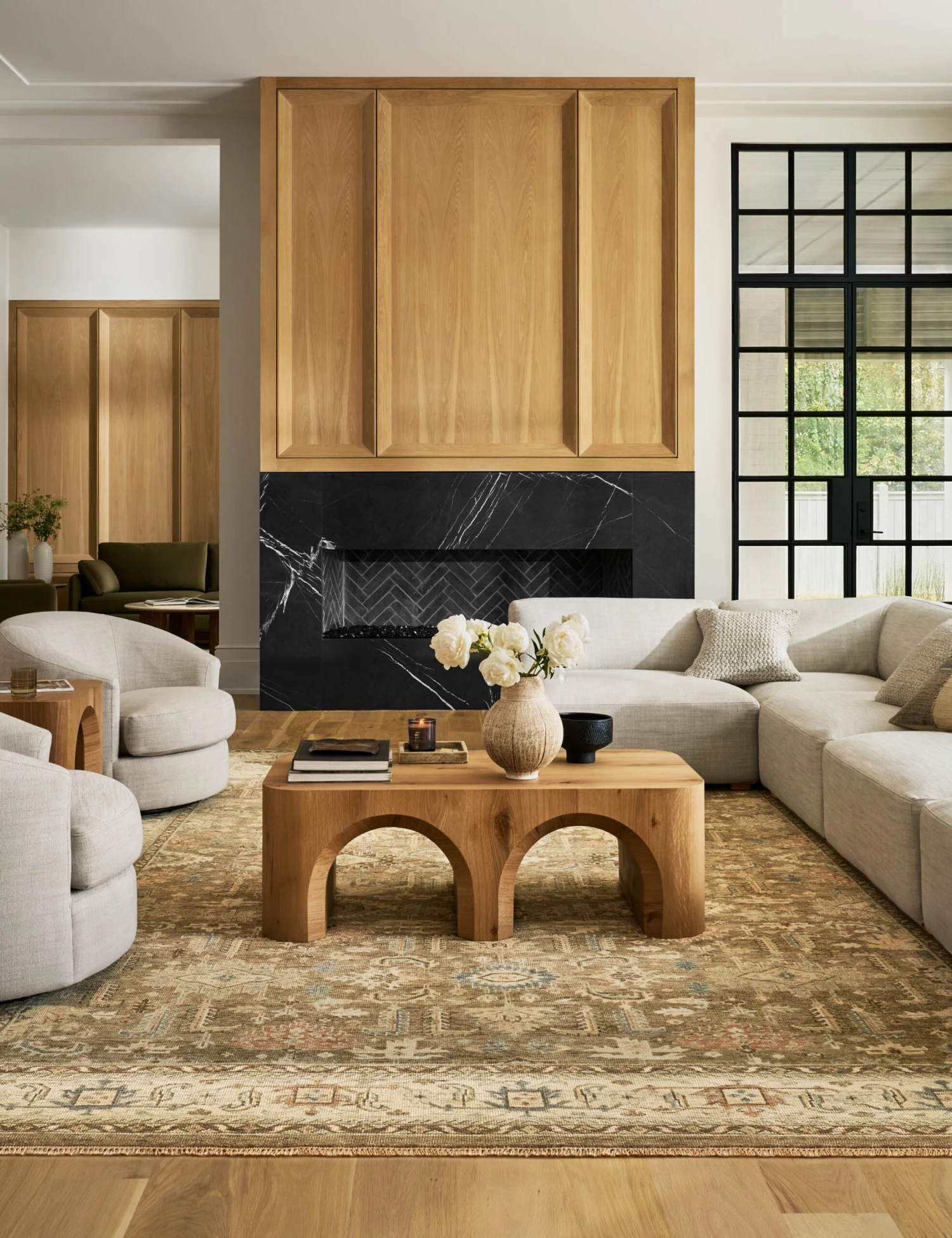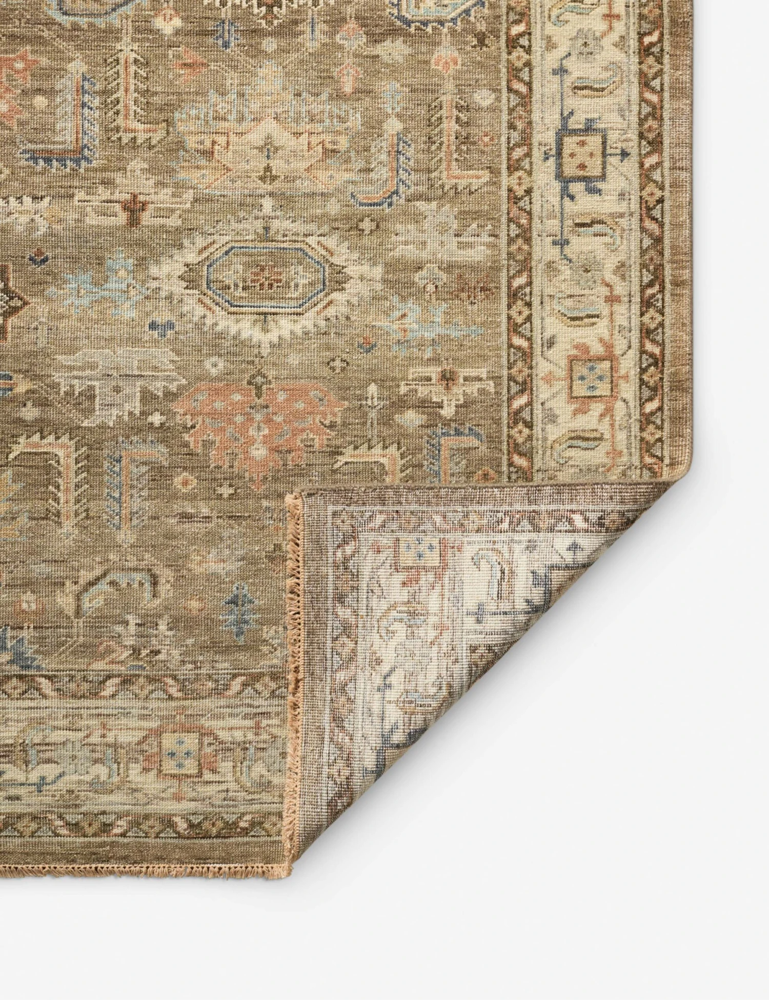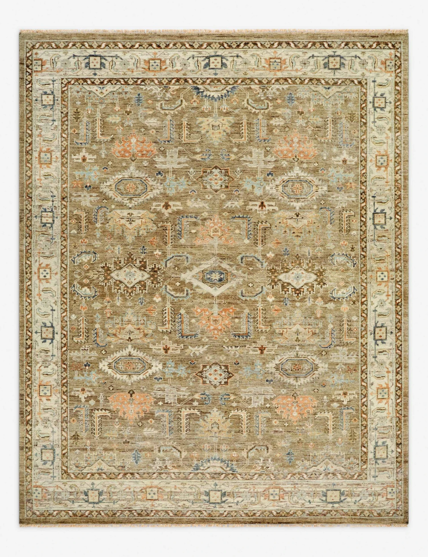 The Percival rug sets a timeless foundation with its traditional pattern and hand-knotted construction. A no-pile finish keeps the look tailored, while fringe detailing offers a warm accent. This wool rug is perfect for grounding layered, high-style interiors.