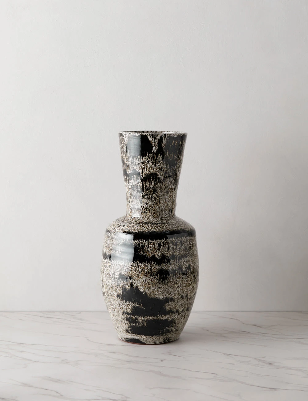 High-contrast neutrals create a vibrant design across this handmade ceramic vase. The tall body and high-gloss finish make this piece an ideal vessel for seasonal arrangements.