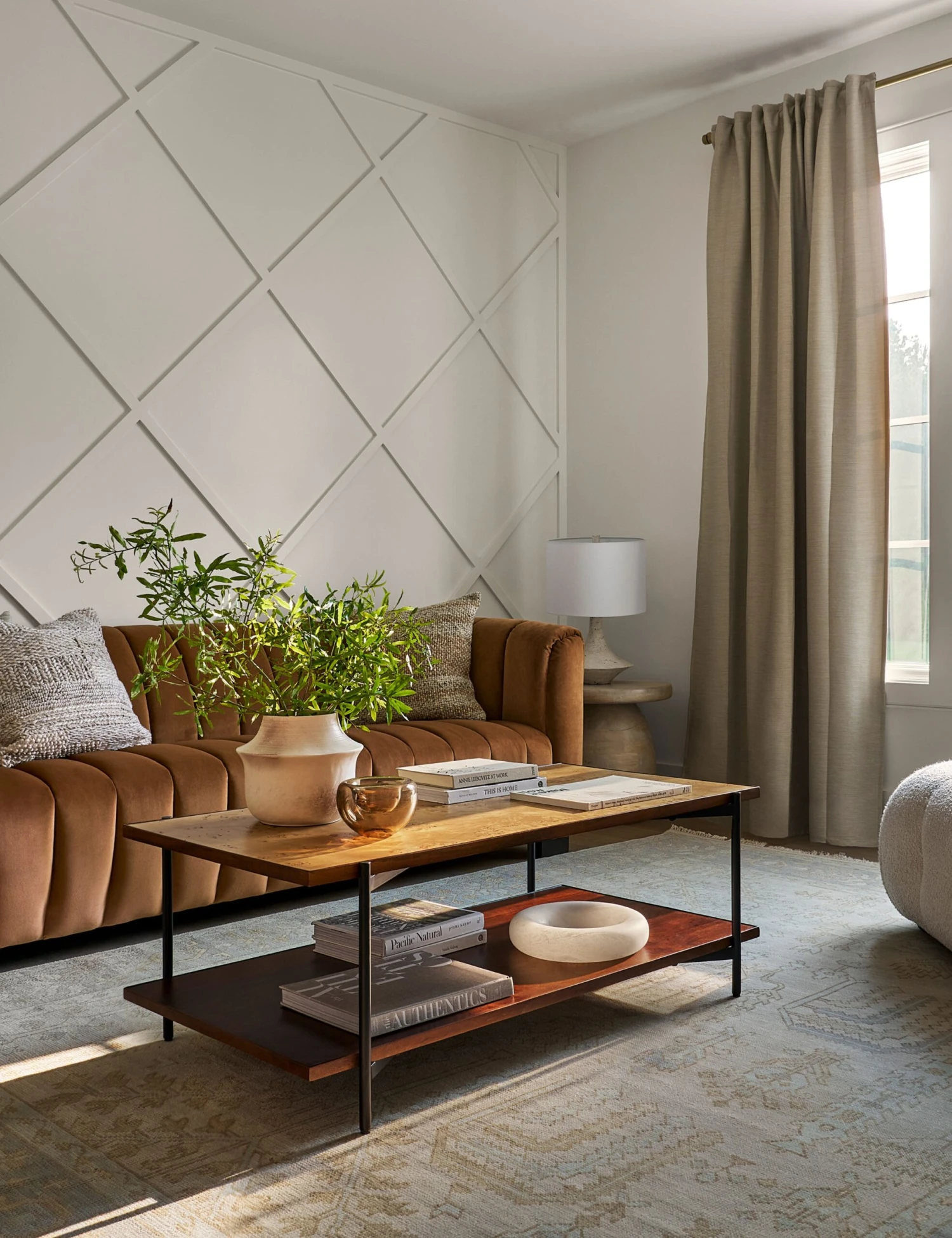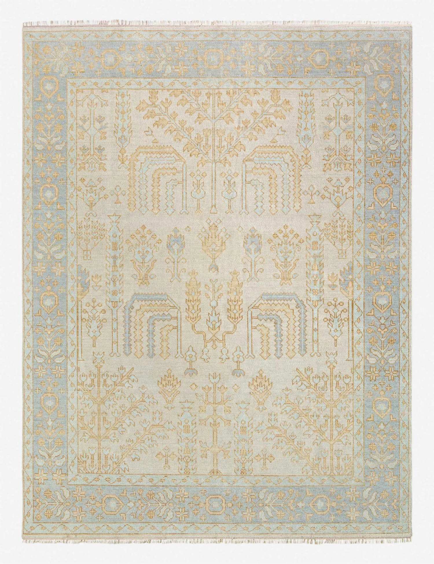 The Phoebe rug refreshes timeless motifs with a touch of color. Hand-knotted from wool, it is an heirloom piece ready for modern interiors. The medium pile and subtle fringe add softness underfoot, making this handmade rug a timeless foundation for living rooms, libraries, or formal spaces.