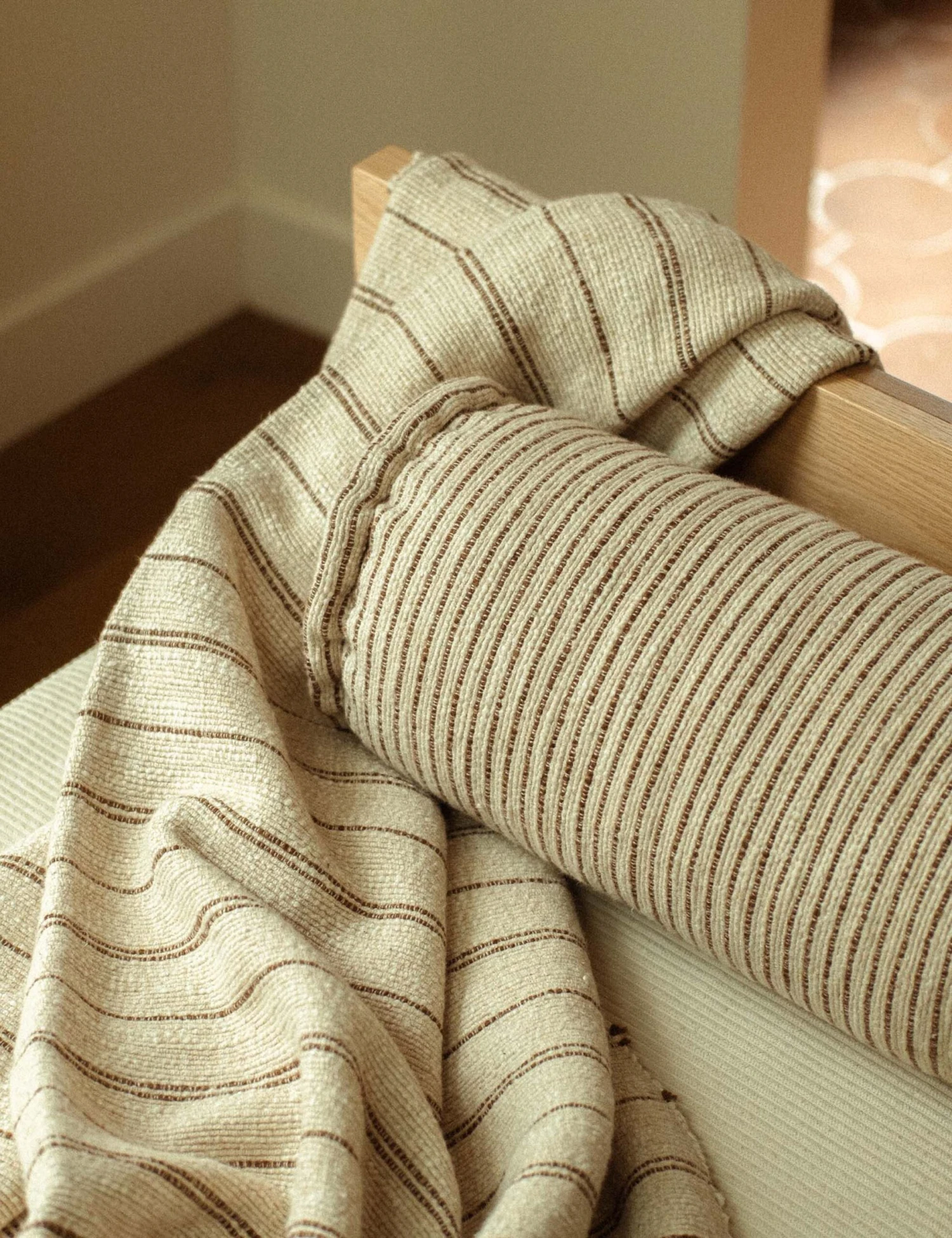 Morrow Soft Goods brings sustainability to beauty—creating lasting products with a mindful approach inspired by the colors, patterns, and textures of nature. The Pia pillow adds a touch of warmth to your sofa or bed with its chestnut stripes and grounding neutral tone. We love the versatility of this bolster pillow as a finishing touch for an effortlessly modern curation.