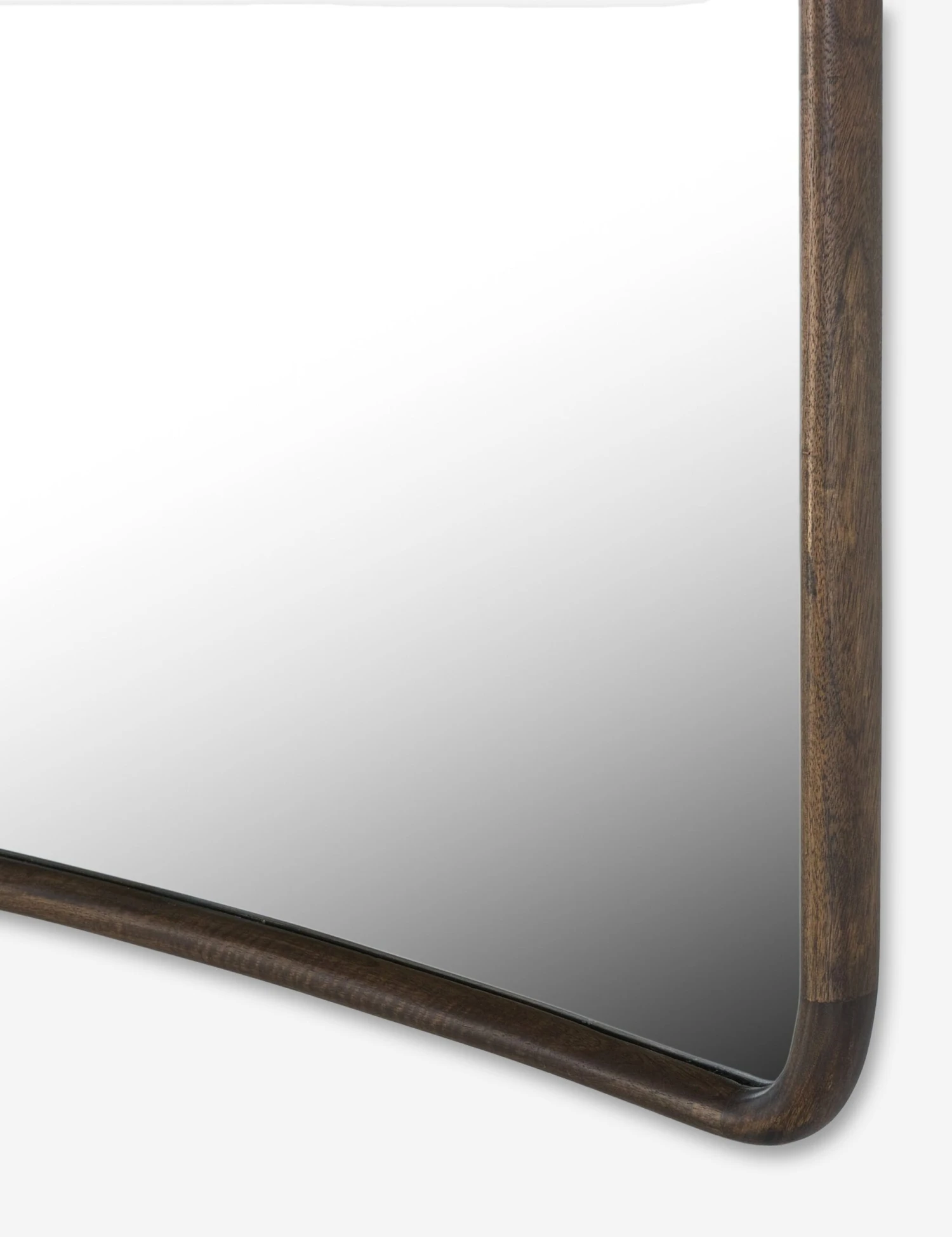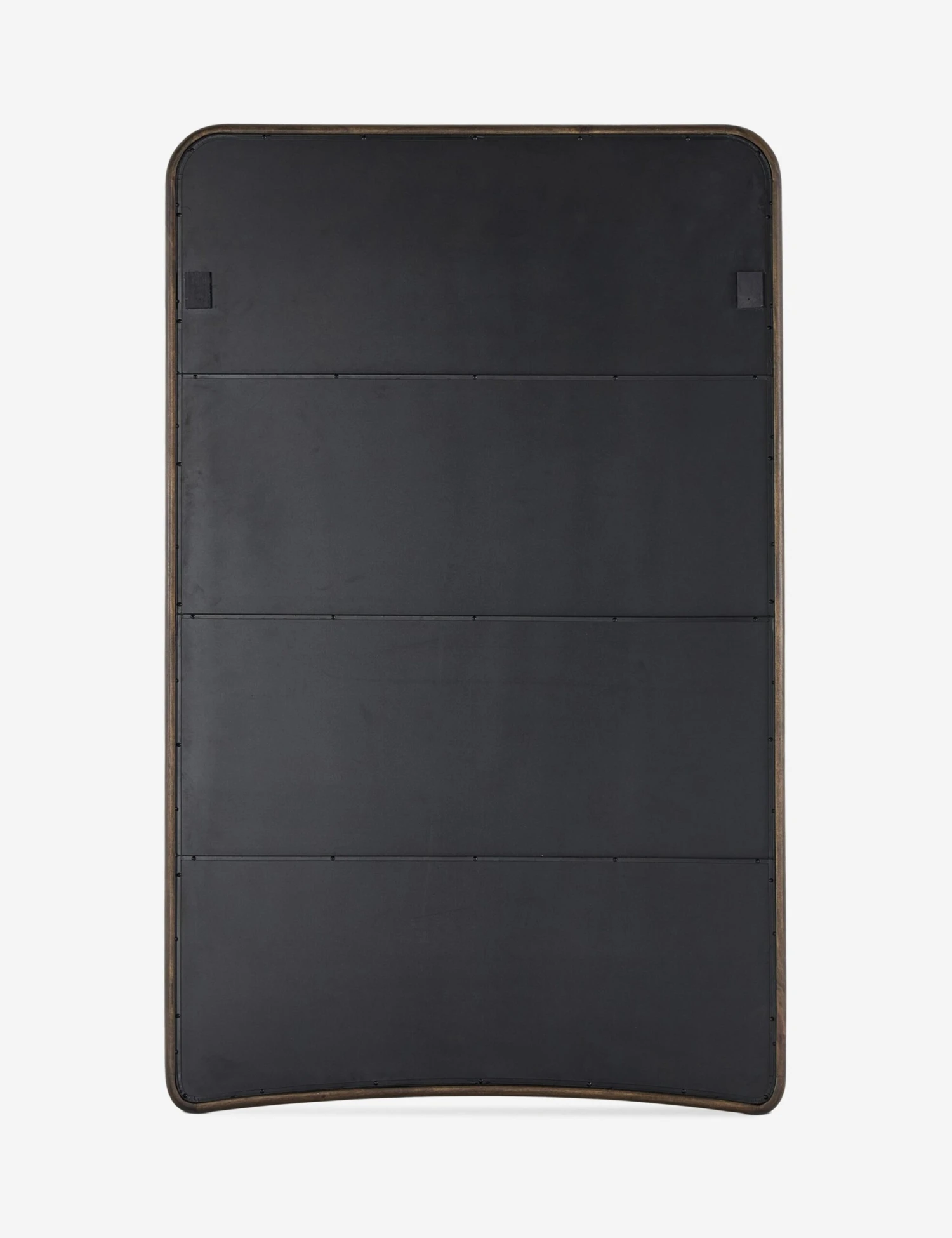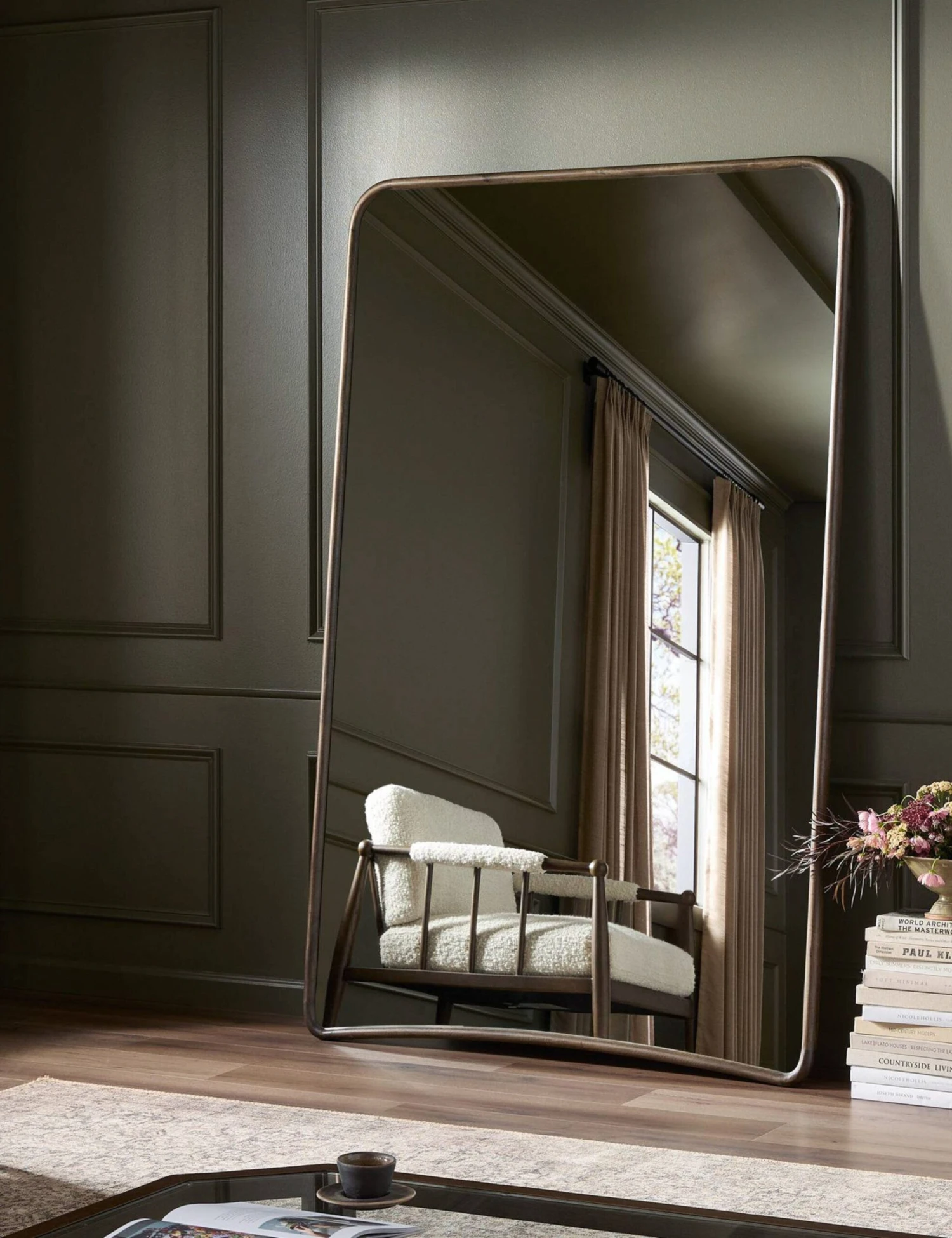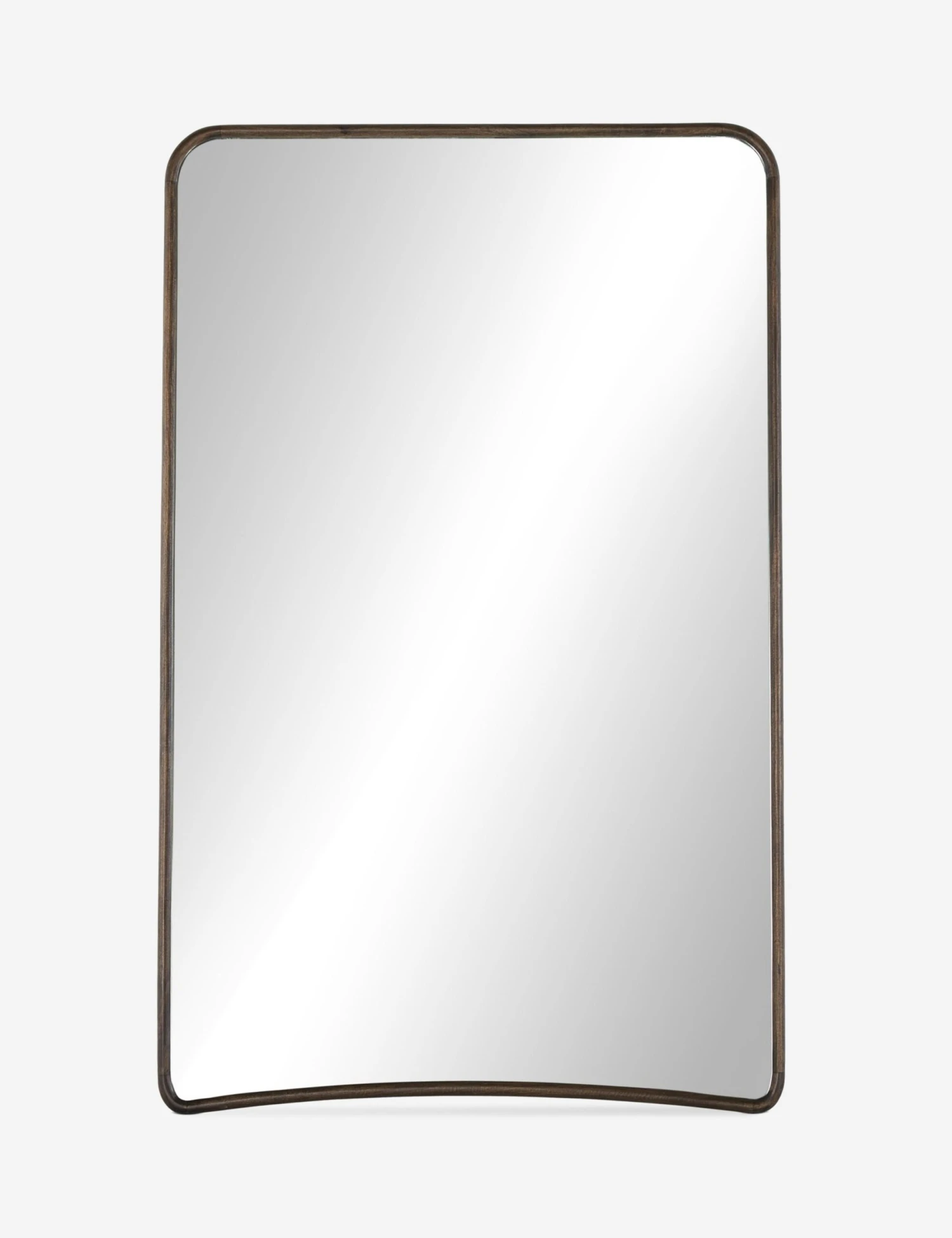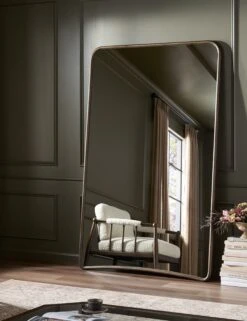 Sleek yet substantial, this floor mirror features a gently arched base and rounded corners for a thoroughly refined silhouette. The slim metal frame lends a modern edge, balancing soft curves with clean lines. Oversized in scale, this floor mirror offers a quiet statement that brings light, depth, and polish to any room.