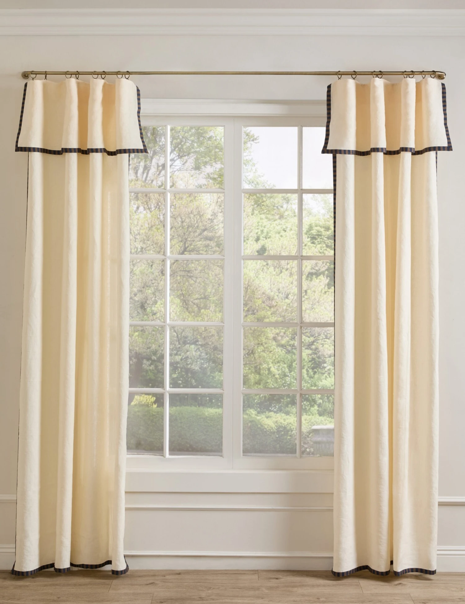 This curtain pairs lightweight linen with a striped border for a look that’s airy yet crisply defined. The sheer fabric softens the light, while the tailored edge brings a clean finish to the room. This window treatment is from our exclusive Sarah Sherman Samuel collaboration and features all the trademarks of her warm, edited style.