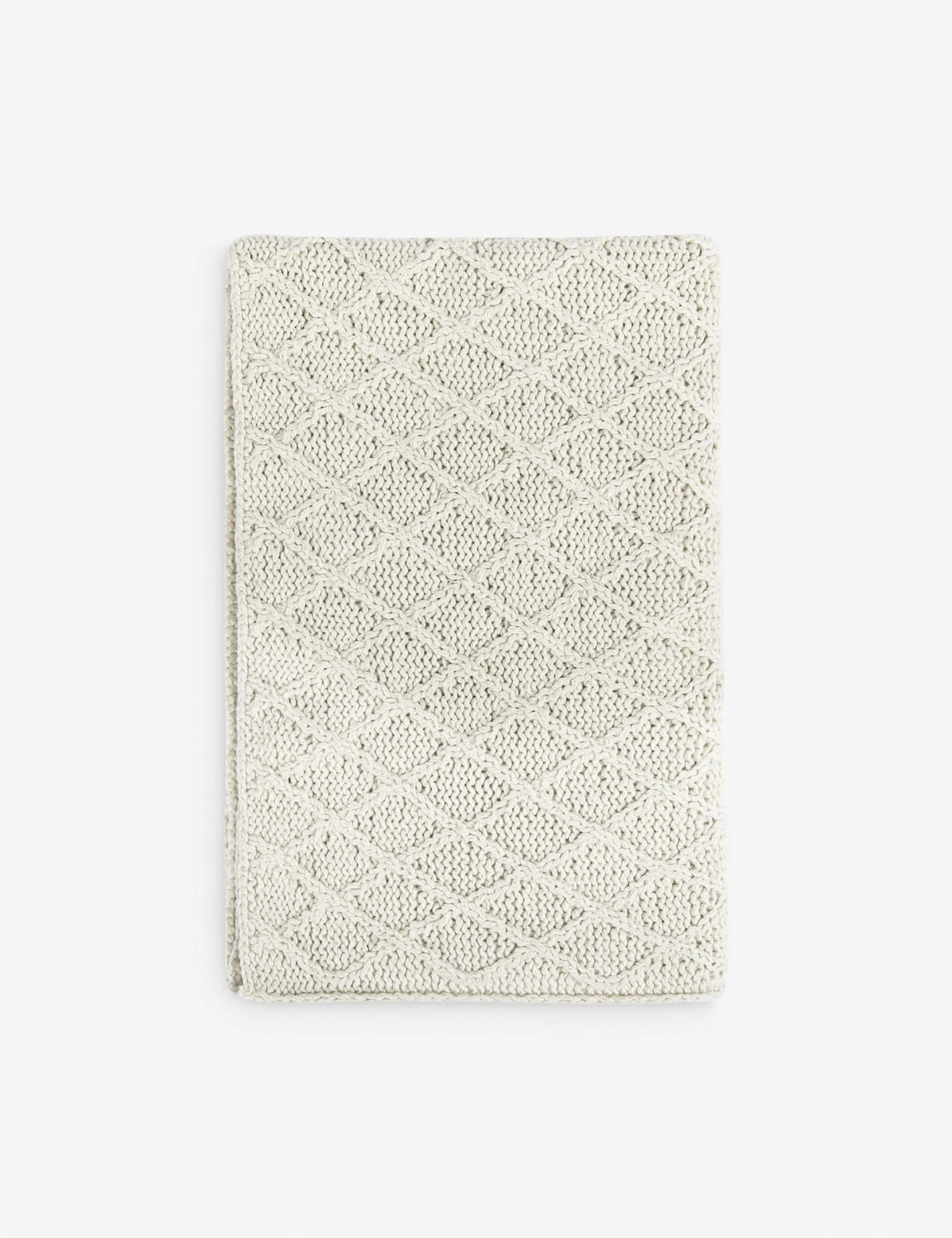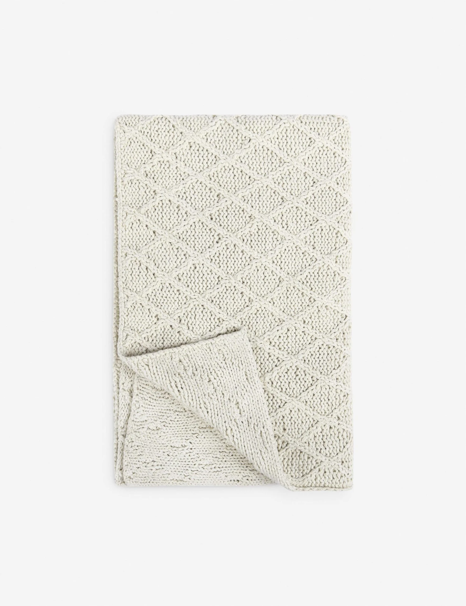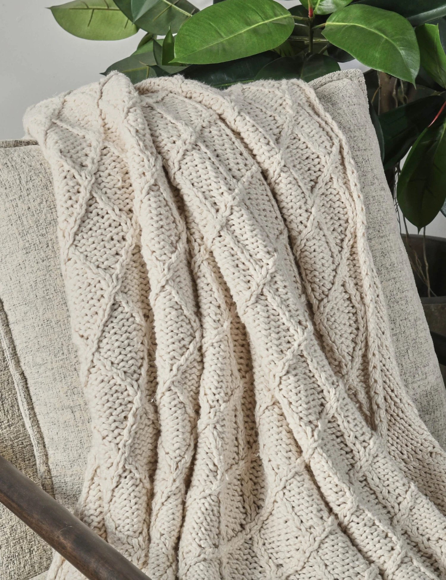 The Russi throw is hand-knit with a classic diamond lattice pattern. The chunky cotton offers a soft touch for tactile comfort. The solid ivory design makes this a versatile accent for traditional and modern decor.