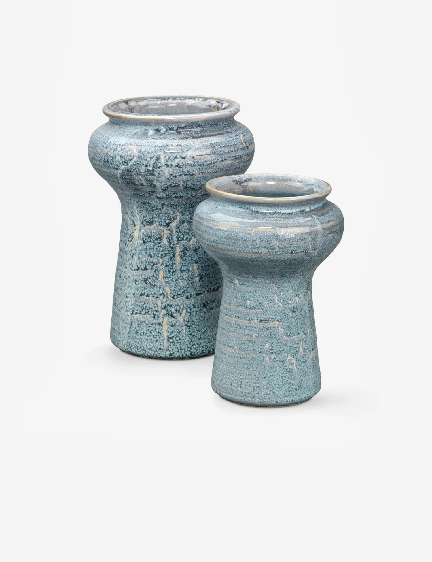 Add a cool depth to your decor with this vase duo. The sinuous shapes evoke the slow churn of rolling waves, while the reactive glaze captures the shifting tones in the wash of the tide. We love this set for an elevated art piece in a coastal or modern curation.