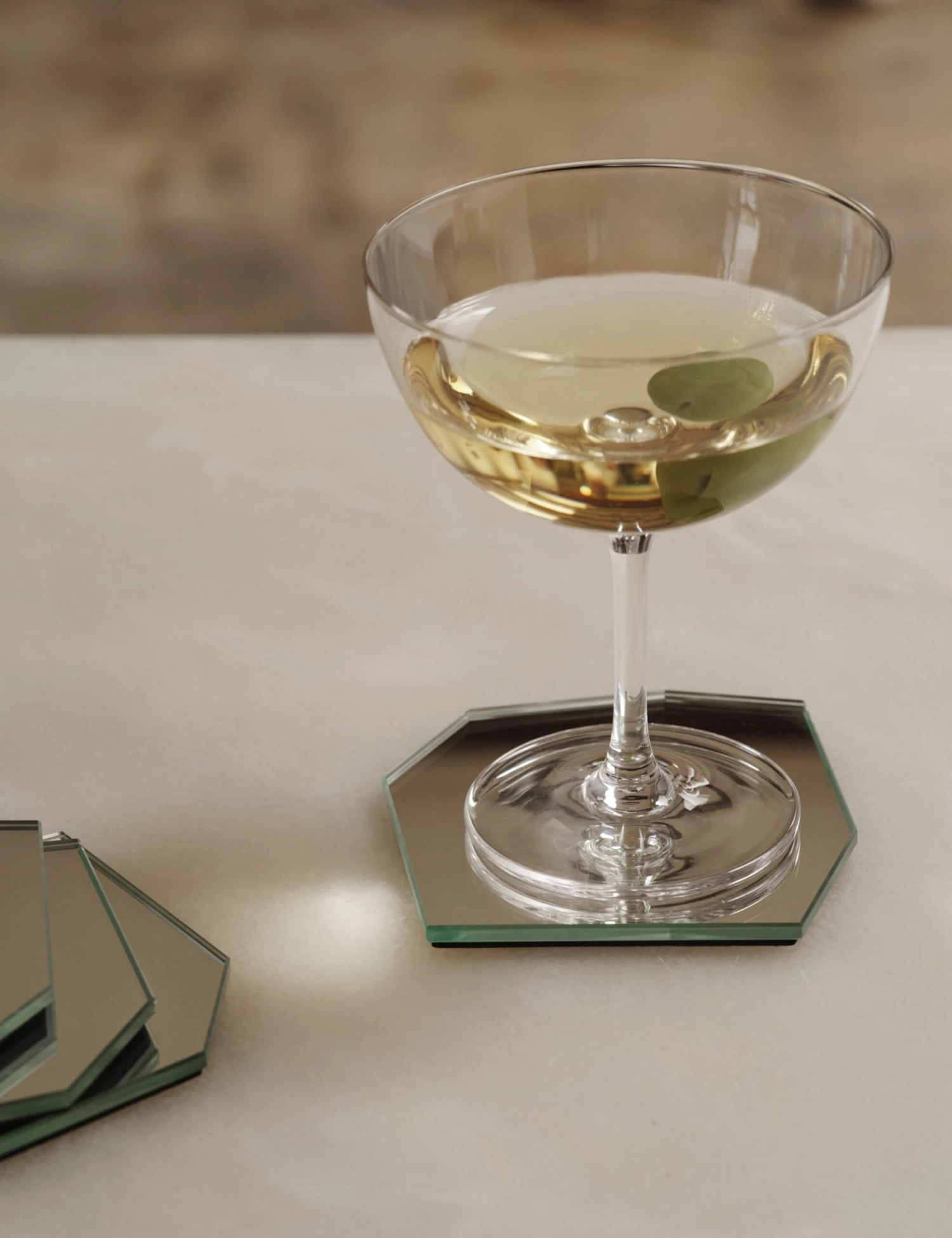 Add a striking touch of polish to your curation. With sharp, angular lines, these mirrored glass coasters bring an artful edge to the table. From coffee to cocktails, they offer a design-forward detail perfect for entertaining.