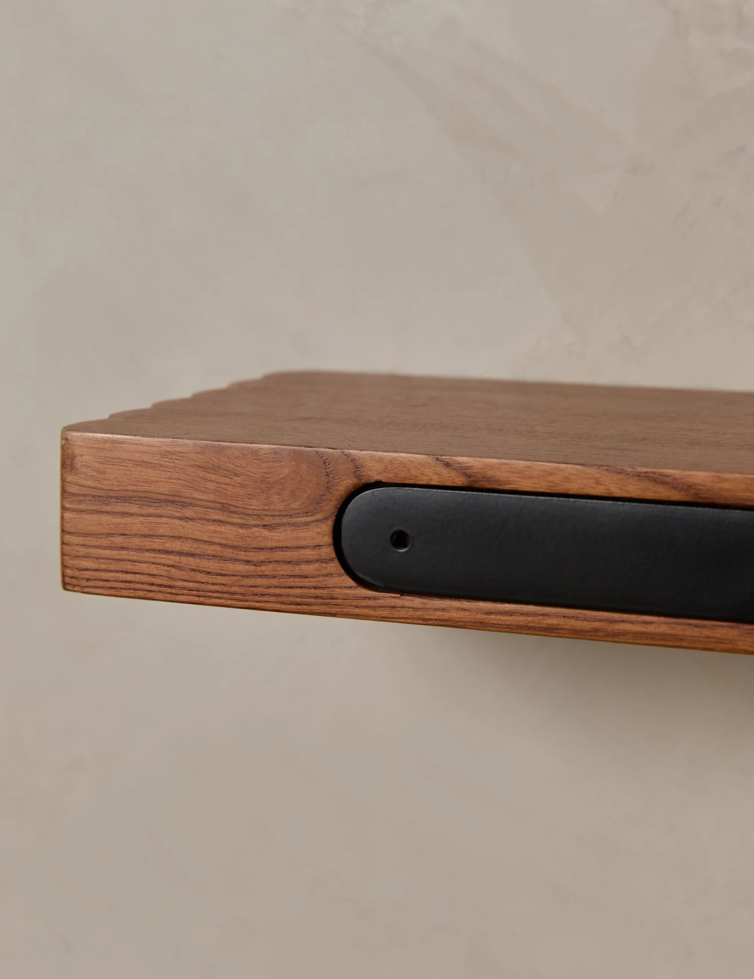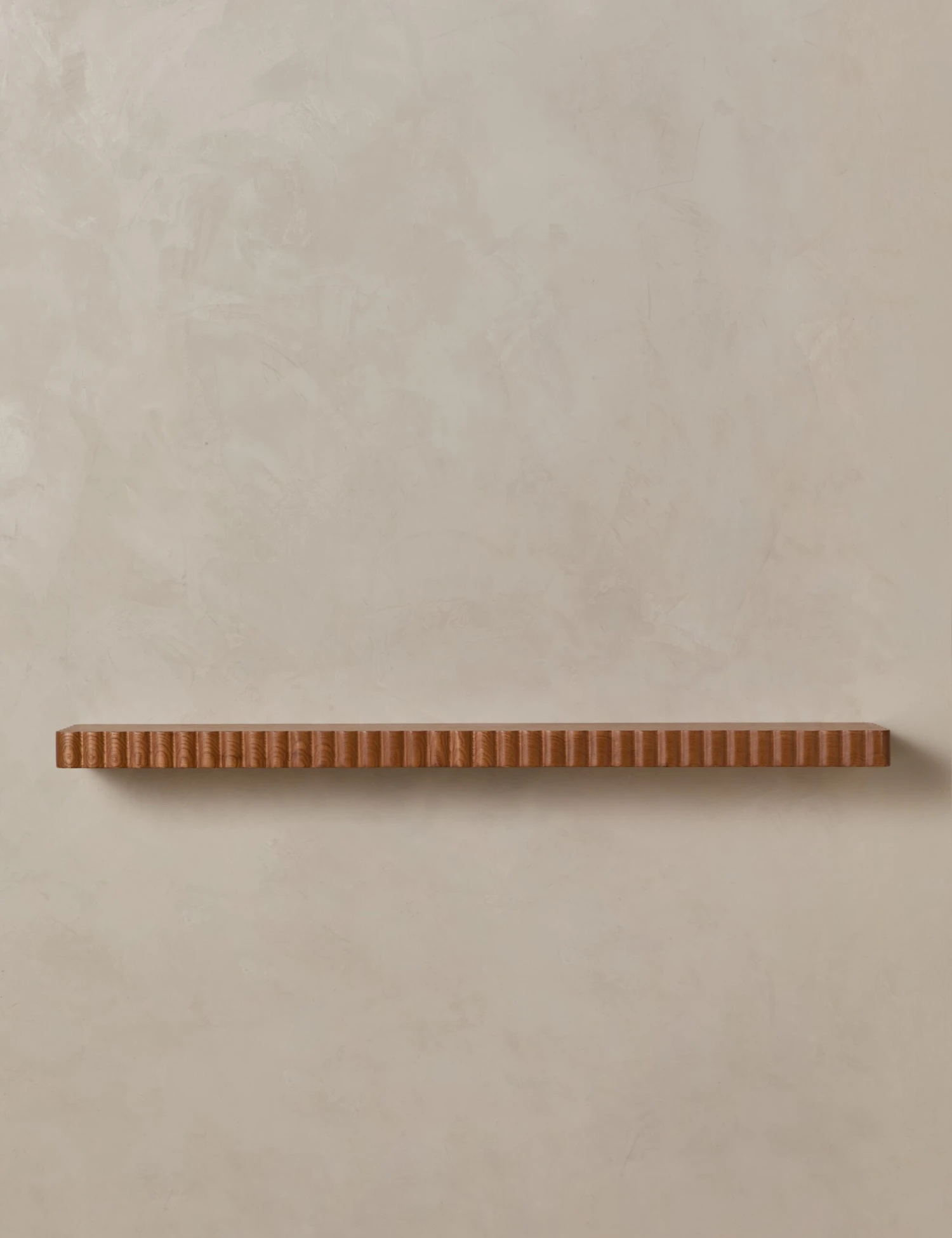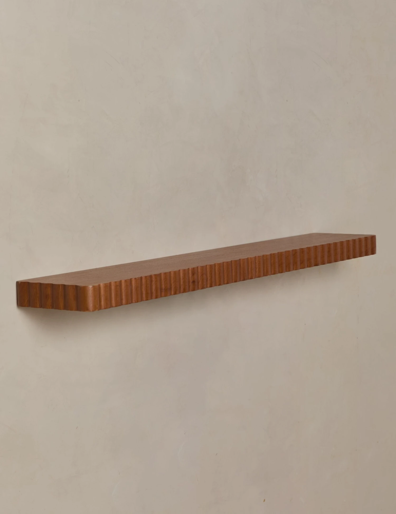 Create a layered moment in your wall decor with our Suela shelf. Scalloped detailing and warm wood grain add texture and charm, while the streamlined form lets your books, decor, or art stand out.