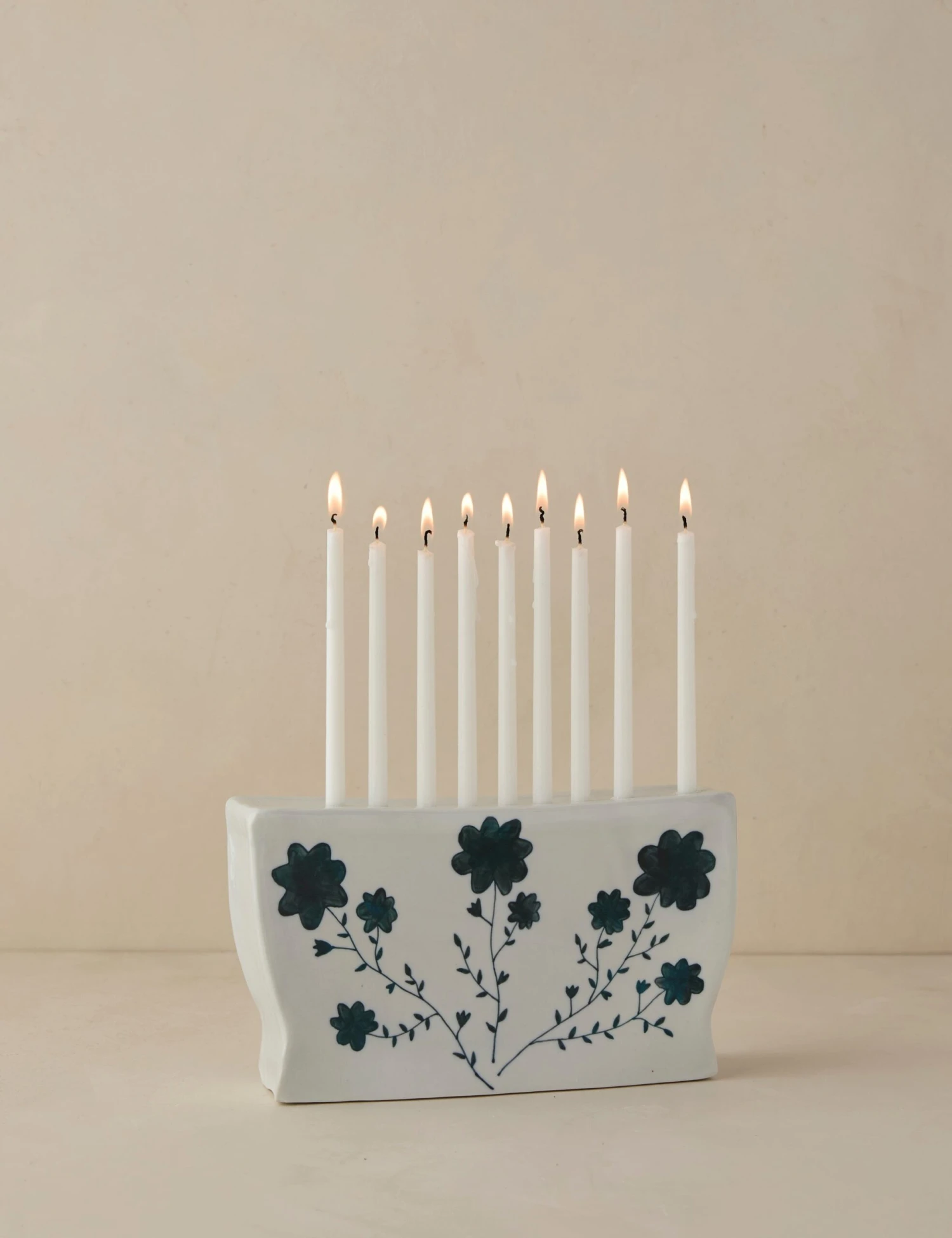 Los Angeles-based ceramicist Stephanie Dawn Matthias’s work recalls the traditions of European folk art in small-batch, luxury ceramics—handcrafted and hand-painted to bring a timeless touch to modern interiors. This menorah adds warmth to the season with its clean shape and elegant floral design.