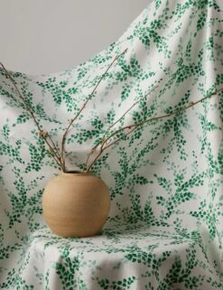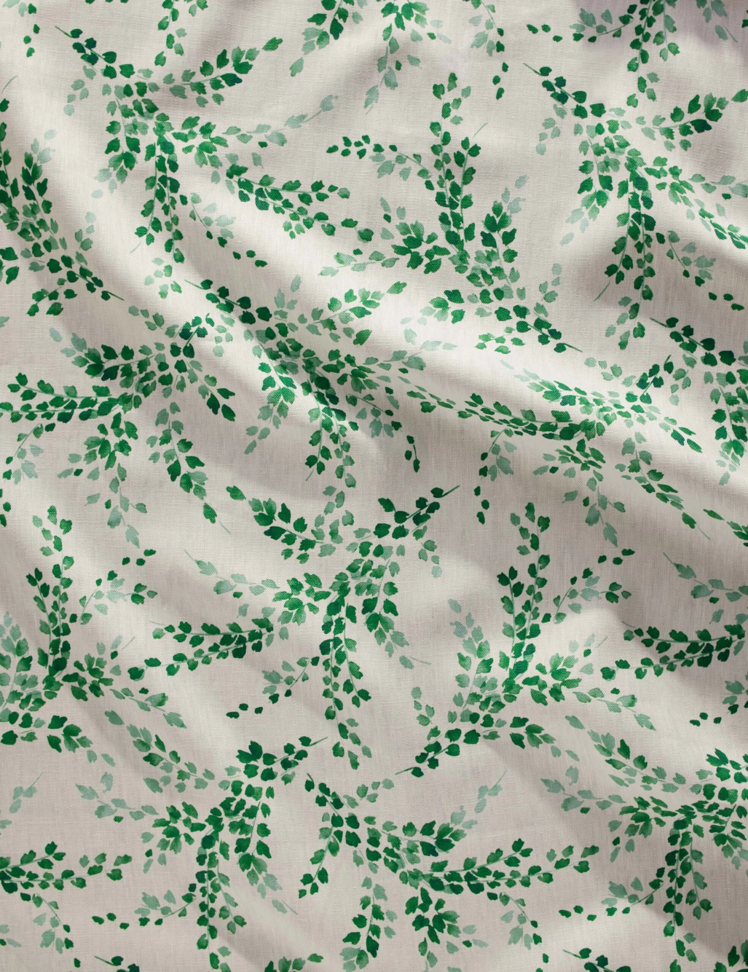 Delicate green vines create a soft botanical motif on a neutral backdrop in this versatile textile design. This linen fabric is perfect for adding a fresh touch of vintage inspiration with bespoke curtains, pillows, table linens, or furniture.