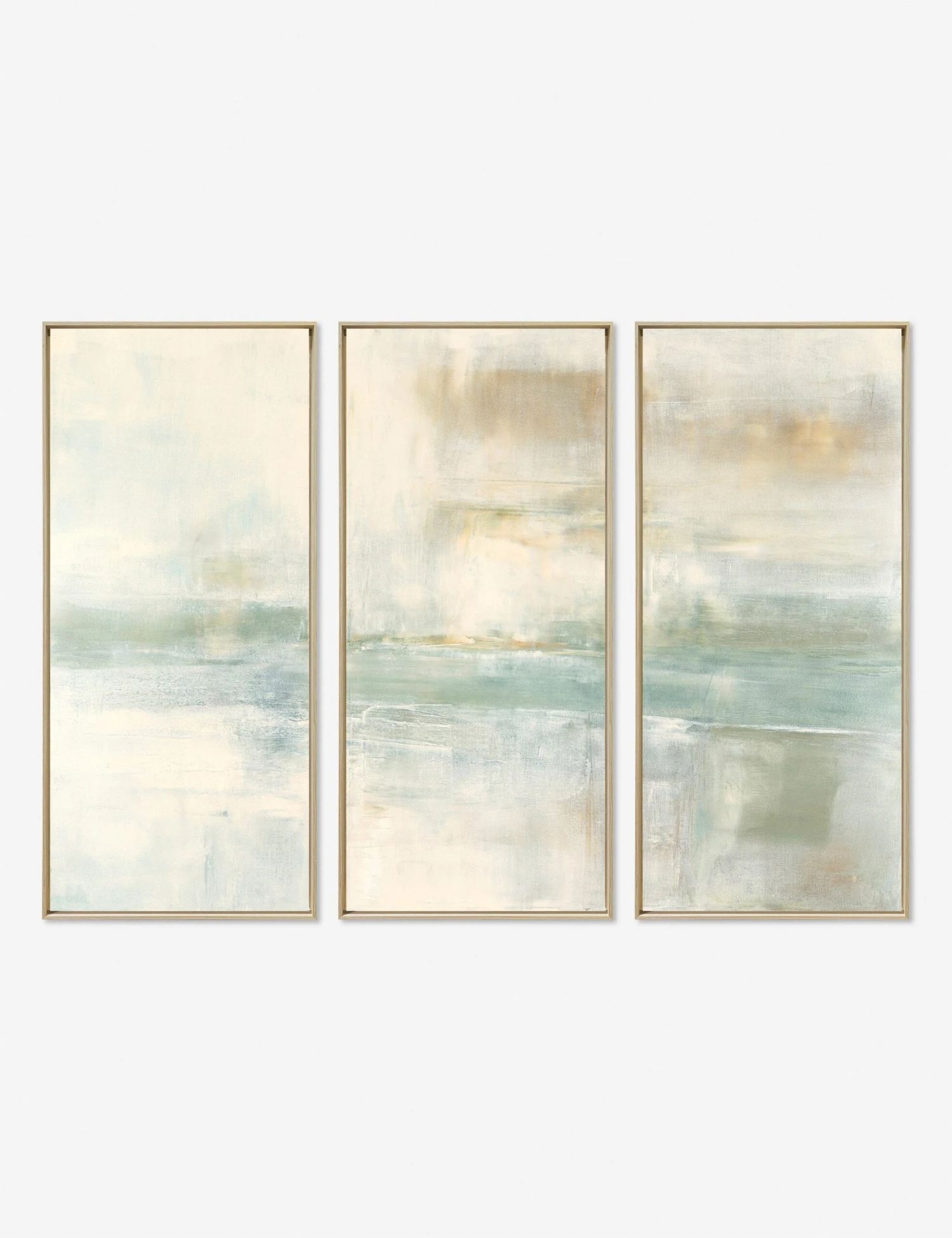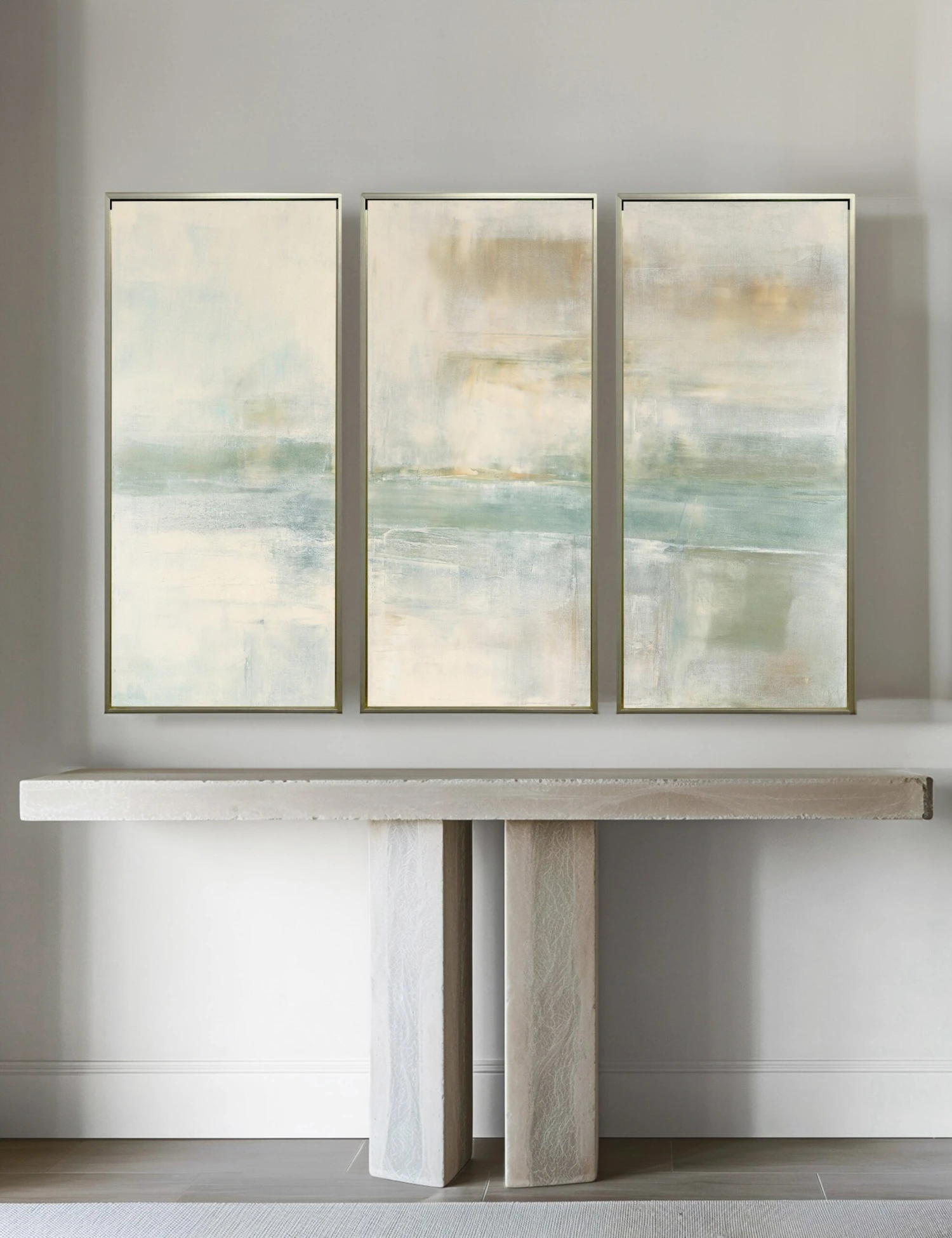 In this abstract wall art set by Carol Benson-Cobb, pale blush tones layer with soft sage greens to create a quiet impact. With its masterfully blended palette and ethereal composition, this artwork inspires a space that feels sophisticated and serene.