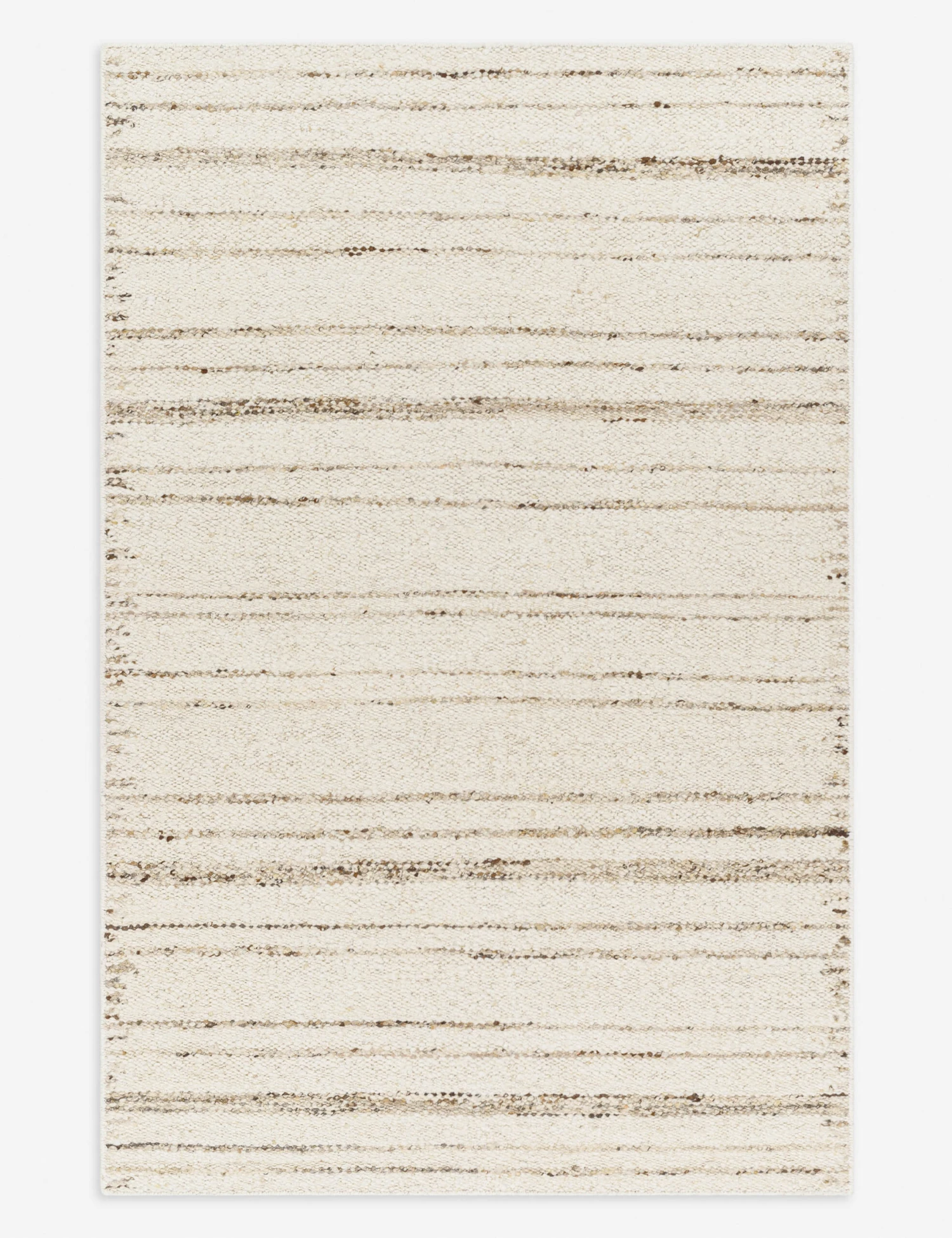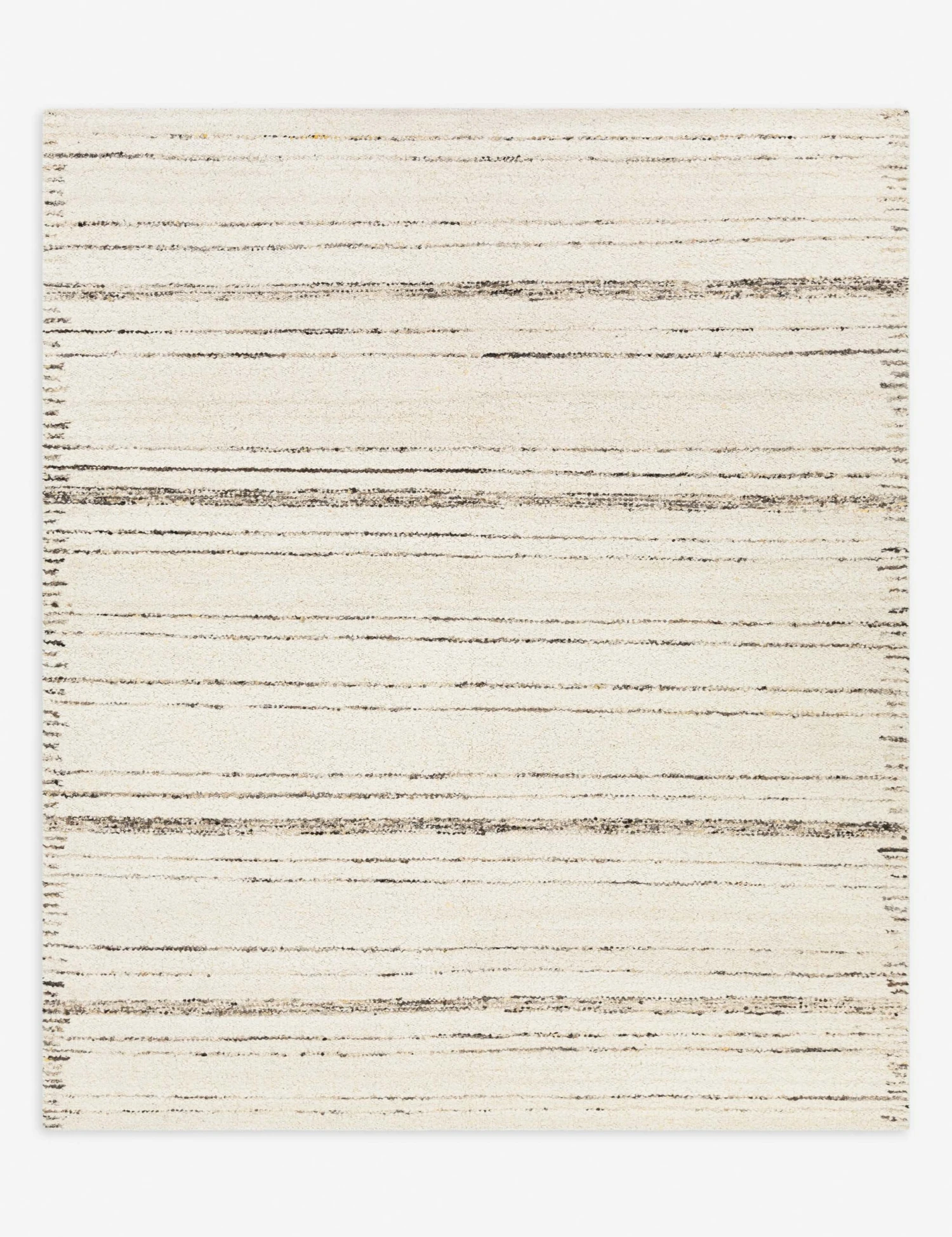 A plush woolen pile and minimalist design fashion this rug for understated elegance. We love the bright feel its light palette brings to a room—grounded with simple stripes in mineral tones. This hand-knotted rug sets a versatile foundation that will last years.