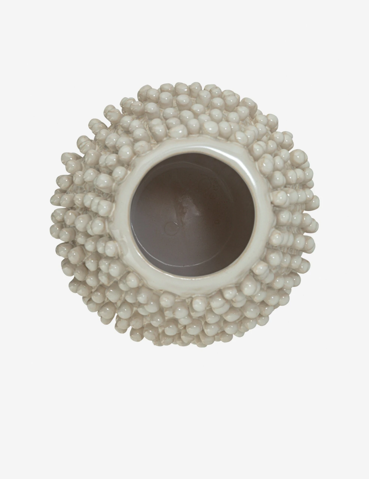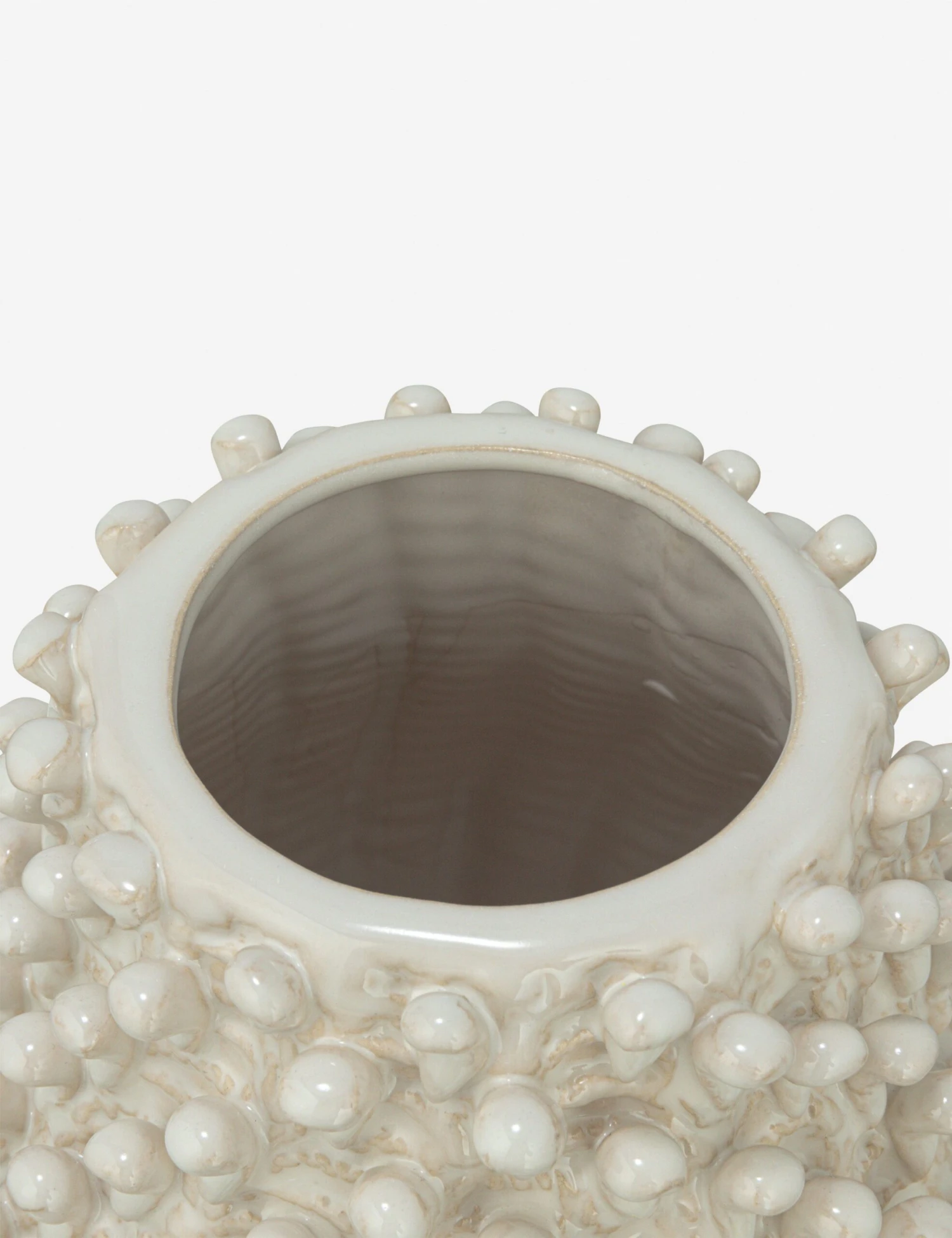 A richly textured surface and creamy glaze give this stoneware vase a playful yet refined effect. Display it as a standalone statement or fill it with stems to add height and texture to your space.