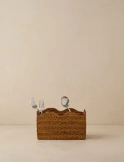 Bring a fresh look to your kitchen or dining space with the scalloped edge and woven texture of this rattan utensil caddy. Perfect for flatware, napkins, or sauces, it keeps essentials within reach while adding a layer of organic warmth to your table or countertop.