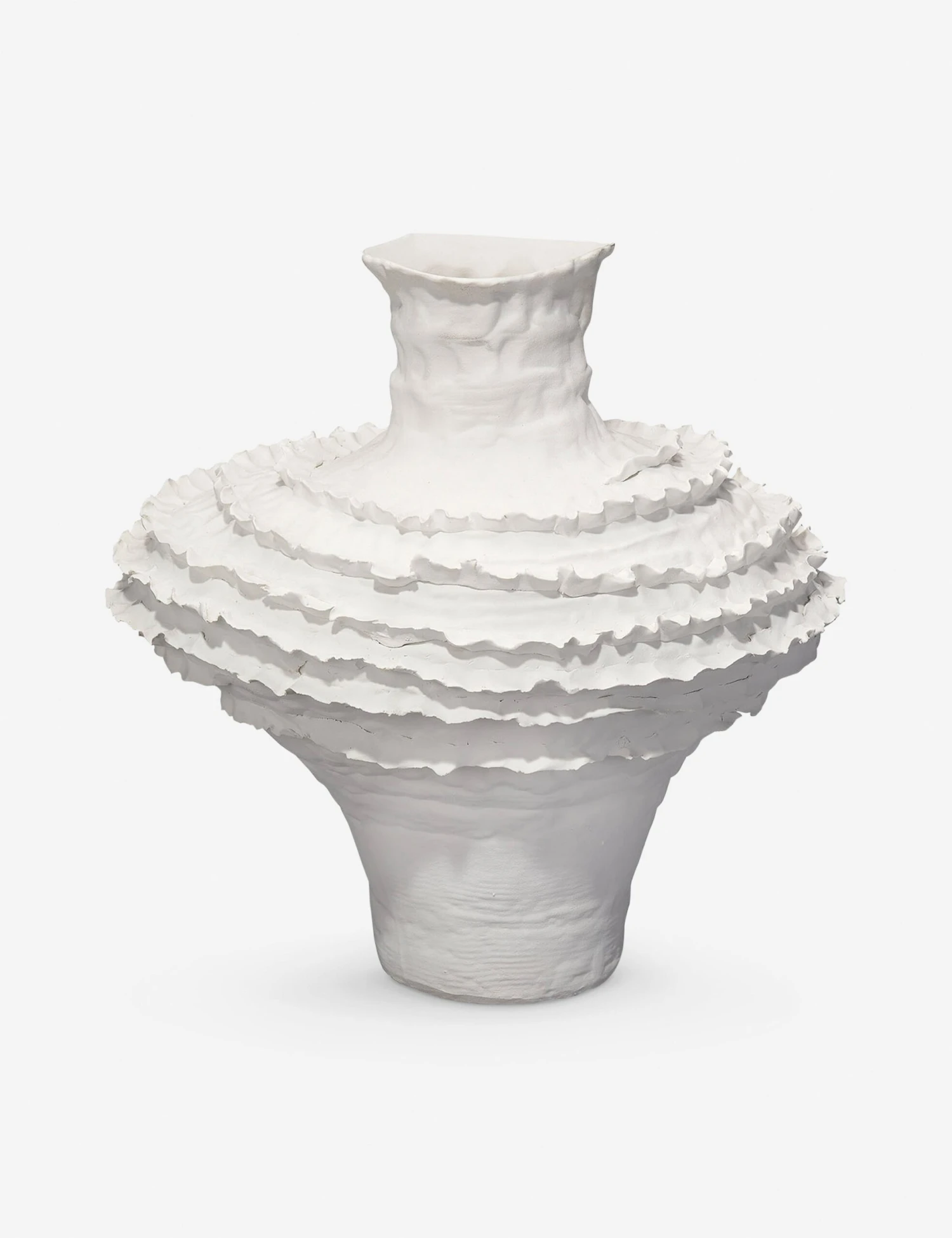 This artisan-made vase offers delicate textures set in ceramic. Its ruffled details and artisan marks set off the white vase with a striking silhouette that marries elegant design with a grounding handcrafted touch.