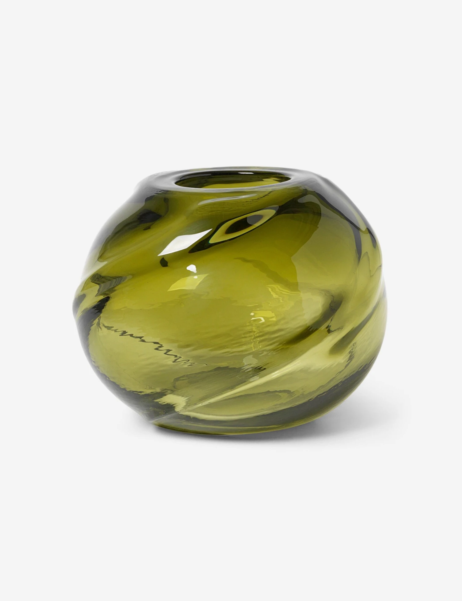 This round vase holds a sense of motion in its fluid design. Each piece is mouth blown into a a singular form with unique twists and curves. The colored glass filters light for a stimulating effect—perfect for a sunlit entryway, kitchen, or lounge.