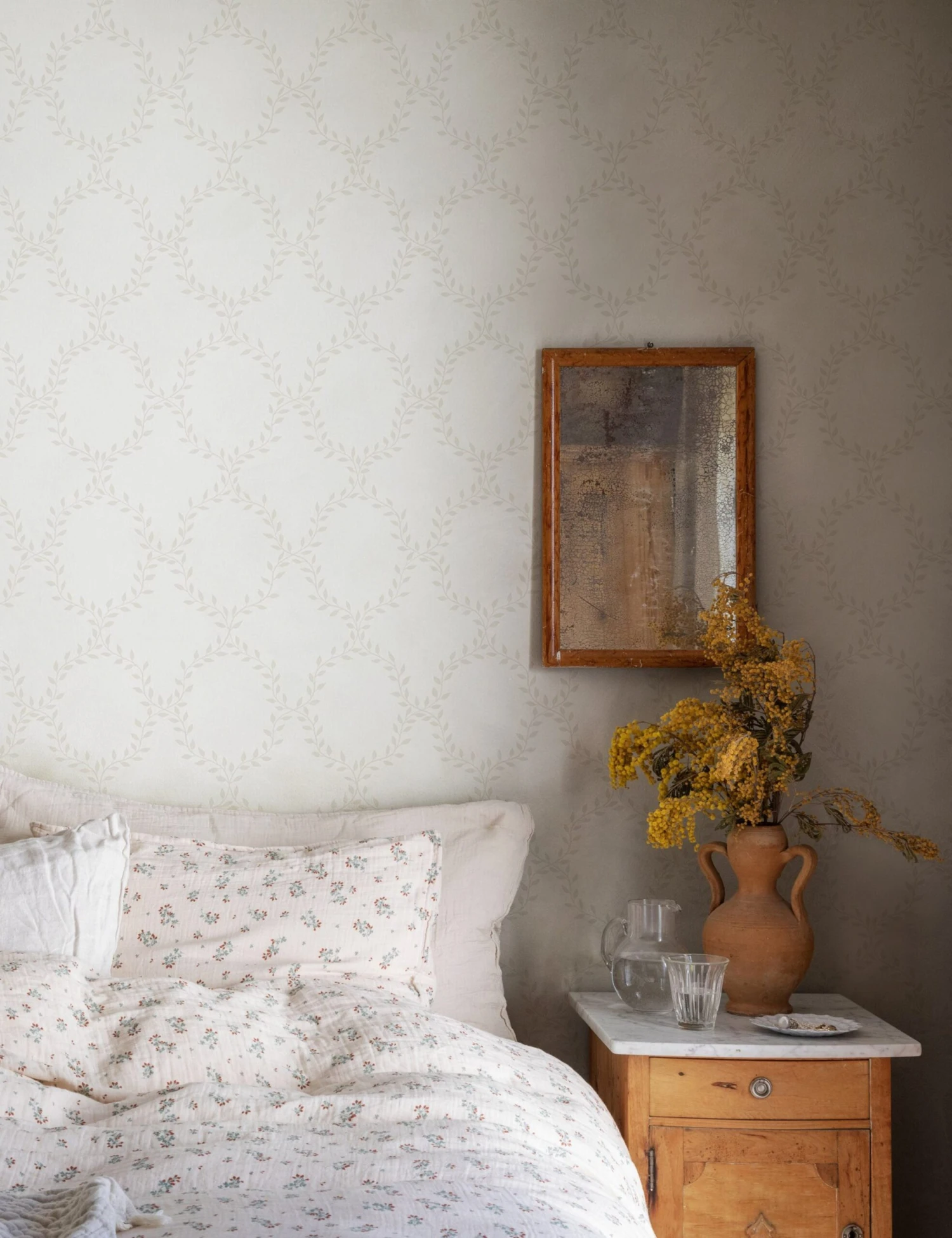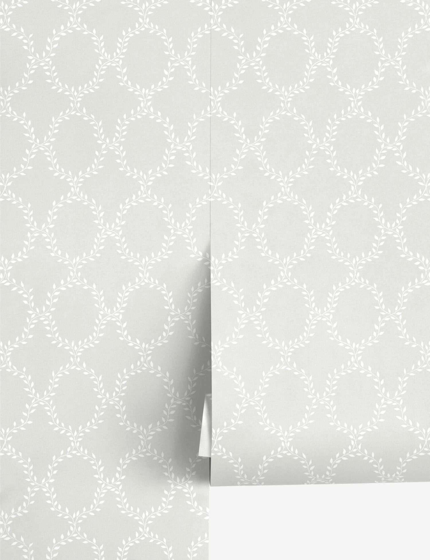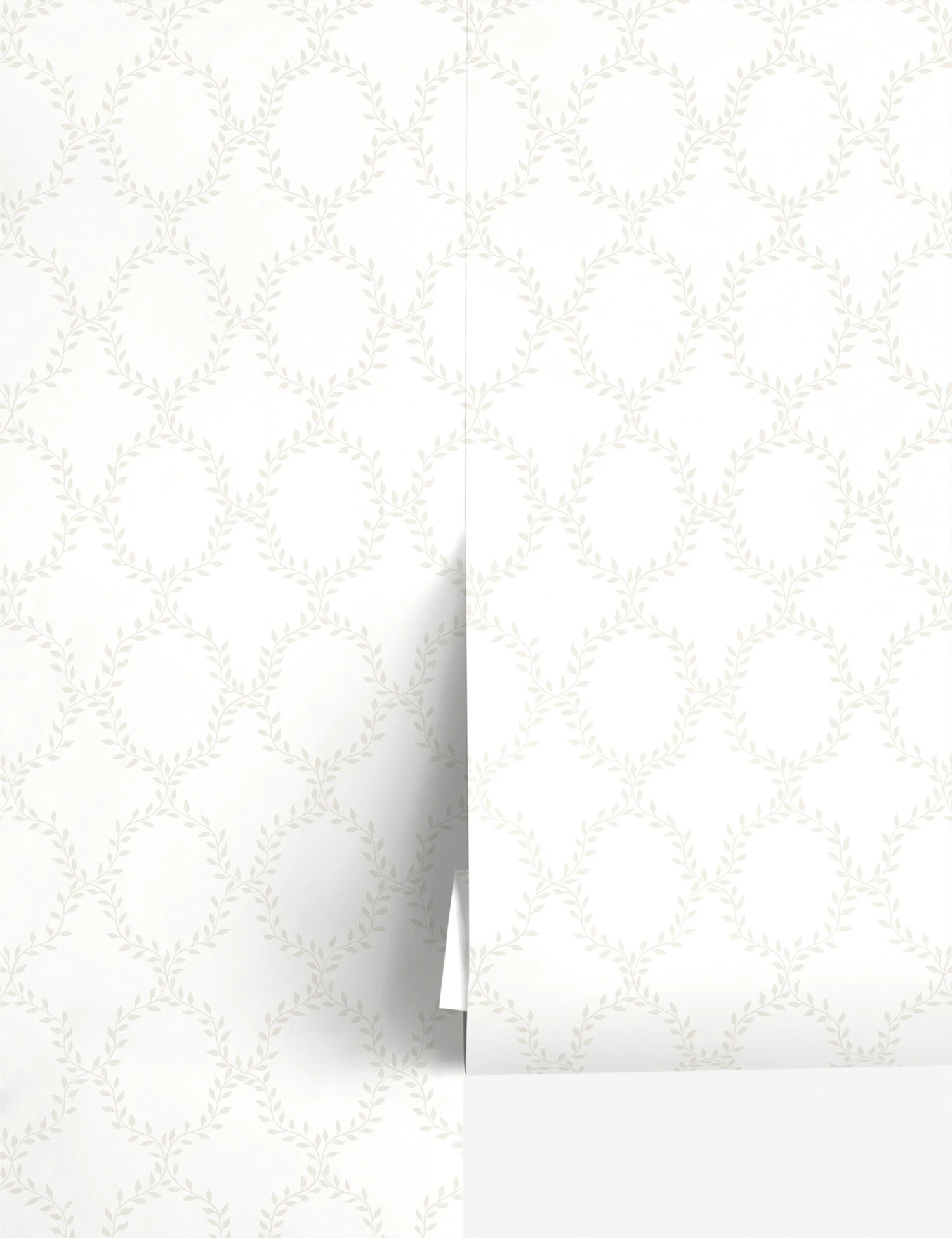 A laurel trellis fills this beautifully patterned wallpaper with botanical details in a striking geometric design. We love the lush yet subtle visual texture of this versatile wallpaper for a living room accent wall or full-coverage in a bedroom or bath.